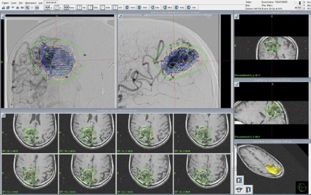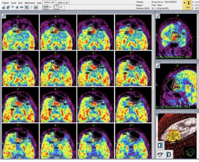 Once all images are registered in Gamma Plan software a details definition of target and vital structures in the vicinity is made which helps in calculation fo dose to various structures while finalizing a treatment plan. Gamma Plan PFX can make a plan using multiple size collimators in combination. This is unique feature in Gamma Knife Perfexion which give conformal radiation plan minimizing radiation to surrounding vital structure. Images from PET can be fused to give better tumor delineation and planning.